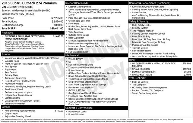 Priced below KBB Fair Purchase Price! Clean CARFAX. 2015 Subaru Outback 2.5i Premium Wilderness Green Metallic CARFAX One-Owner. AWD CVT Lineartronic 2.5L 4-Cylinder DOHC 16V Recent Arrival! Odometer is 49468 miles below market average! 25/33 City/Highway MPG Awards: * 2015 IIHS Top Safety Pick+, Top Safety Pick+ * ALG Residual Value Awards, Residual Value Awards * 2015 KBB.com 10 Most Comfortable Cars Under $30,000 * 2015 KBB.com 10 Best All-Wheel Drive Vehicles Under $25,000 * 2015 KBB.com 15 Best Family Cars * 2015 KBB.com Brand Image Awards * 2015 KBB.com 5-Year Cost to Own Awards * 2015 KBB.com Best Resale Value Awards Reviews: * If you like going off-road to hike, snowshoe, fish, kayak, ski, snowboard, bike, canoe, camp, spelunk, or rock climb, you might already have a Subaru Outback parked in your driveway. The good news is that the Outback SUV is just as good in town as it is on the trail. Source: KBB.com * Spacious and comfortable interior efficient engines excellent visibility above-average off-road ability top safety scores. Source: Edmunds