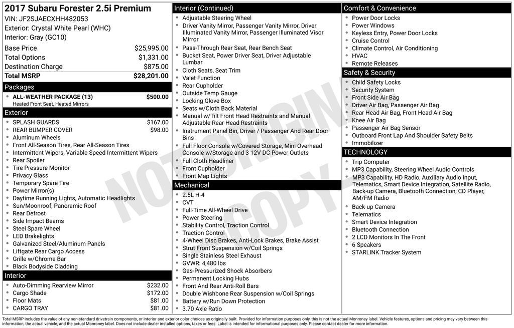 New Price! Forester 2.5i Premium, Crystal White Pearl, Gray w/Cloth Upholstery, All-Weather Package, Automatic temperature control, Exterior Parking Camera Rear, Heated Exterior Mirrors, Heated Front Seats, Power moonroof, Radio: Subaru Starlink 7.0 Multimedia Plus System, Windshield Wiper De-Icer. 2017 Subaru Forester 2.5i Premium Crystal White Pearl AWD Lineartronic CVT 2.5L 4-Cylinder DOHC 16V VVT