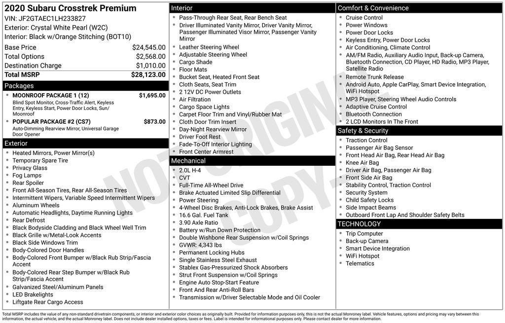**4 New Tires**, AWD, Crystal White Pearl, Black W/Orange Stitching Cloth, AM/FM radio: SiriusXM, Auto-Dimming Mirror w/Compass & HomeLink, Blind Spot Detection (BSD), Exterior Parking Camera Rear, Front fog lights, Heated Front Bucket Seats, Keyless Access w/Push-Button Start, Moonroof Package 1, Popular Package #2, Power Moonroof, Rear Bumper Cover, Rear Seatback Protector, Splash Guards. Clean CARFAX. 2020 Subaru Crosstrek Premium Crystal White Pearl AWD Lineartronic CVT 2.0L DOHC