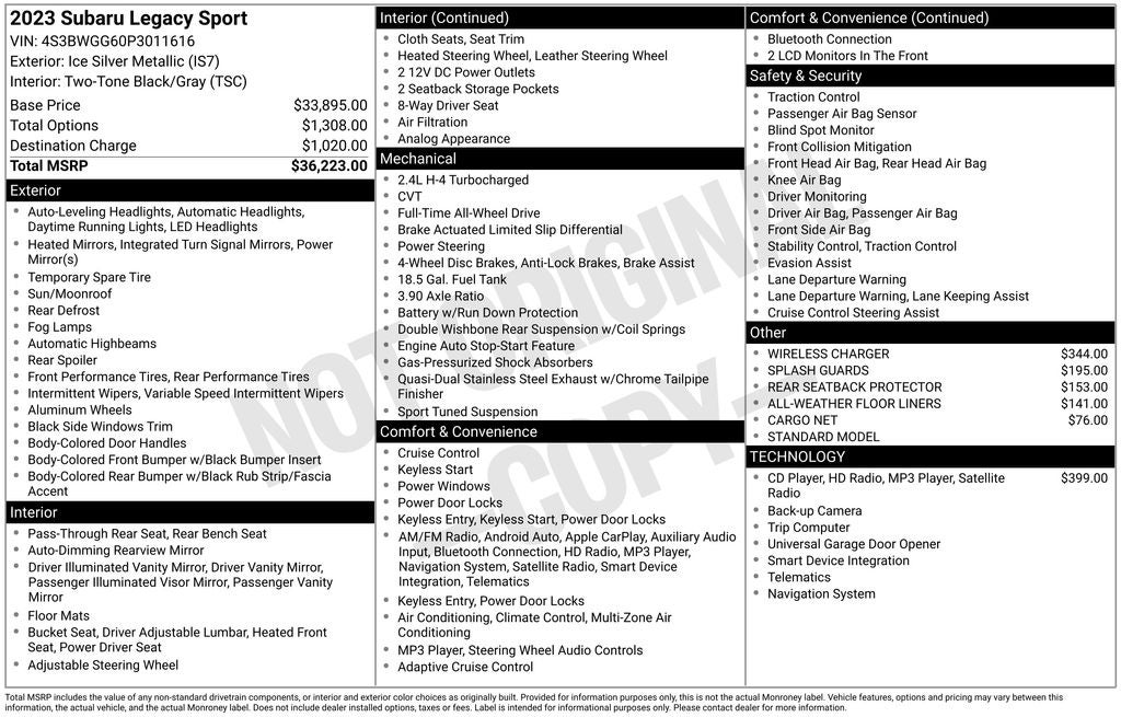 Certified. New Brakes, Auto-dimming Rear-View mirror, CD Player, Exterior Parking Camera Rear, Front dual zone A/C, Garage door transmitter: HomeLink, Heated Front Bucket Seats, Heated steering wheel, Navigation System, Power driver seat, Power moonroof, Radio: Subaru STARLINK 11.6 Multimedia Nav System, Rear Seatback Protector, Splash Guards, Wheels: 18 x 7.5J Aluminum-Alloy Gray Finish. 2023 Subaru Legacy Sport Ice Silver Metallic CARFAX One-Owner. AWD Lineartronic CVT 2.4L 4-Cylinder DOHC 16V